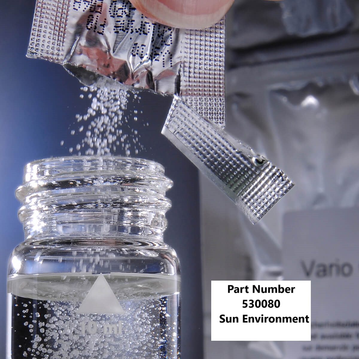 VARIO Chlorine Total DPD Powder Packs are used in the DPD method for chlorine analysis for the determination of combined chlorine and total chlorine. Prior to this, VARIO Chlorine Free is used to determine the free chlorine in the 5 ml water sample. The VARIO Chlorine Total DPD Powder Packs are dissolved in the same discoloured water sample.